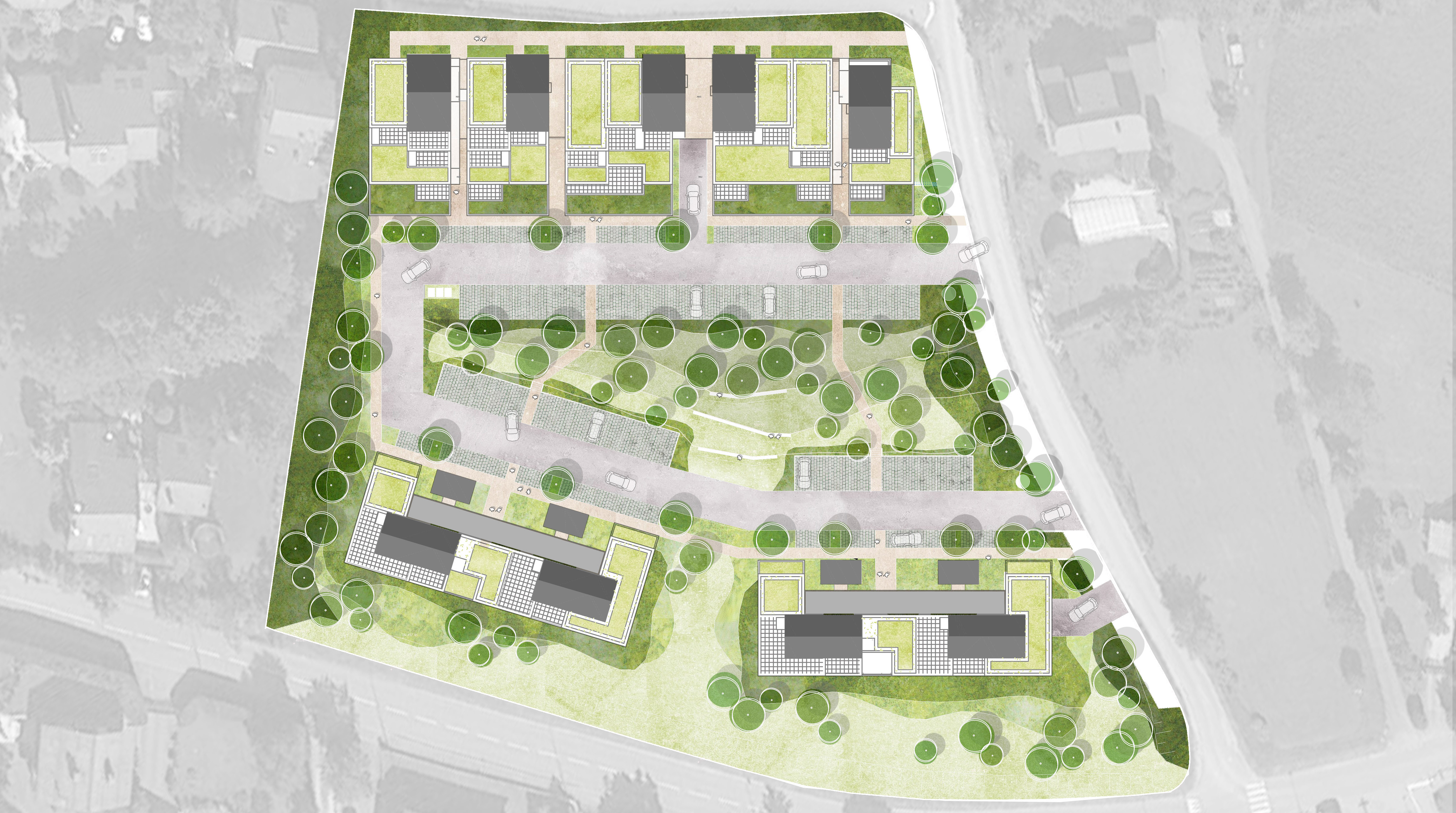Implantée dans un cadre paysager remarquable, au pied du massif du Jura et ouverte sur les vues lointaines des Alpes, la commune de Thoiry présente un territoire aux reliefs marqués. Le projet d’aménagement paysager concerne deux secteurs distincts, Étraz et Allemogne, et s’insère finement dans le site grâce à une lecture attentive de la topographie existante. Les travaux de terrassements permettent d’accompagner les dénivelés naturels, de structurer les niveaux des espaces extérieurs et de garantir l’accessibilité des cheminements. La conception intègre une gestion des eaux pluviales à la parcelle, fondée sur l’infiltration et la rétention, afin de maîtriser les écoulements liés aux pentes et de préserver l’équilibre hydraulique du site. La composition paysagère, appuyée sur une diversité de strates végétales et des cadrages sur le grand paysage, structure les espaces communs et favorise une appropriation libre et durable par les résidents.