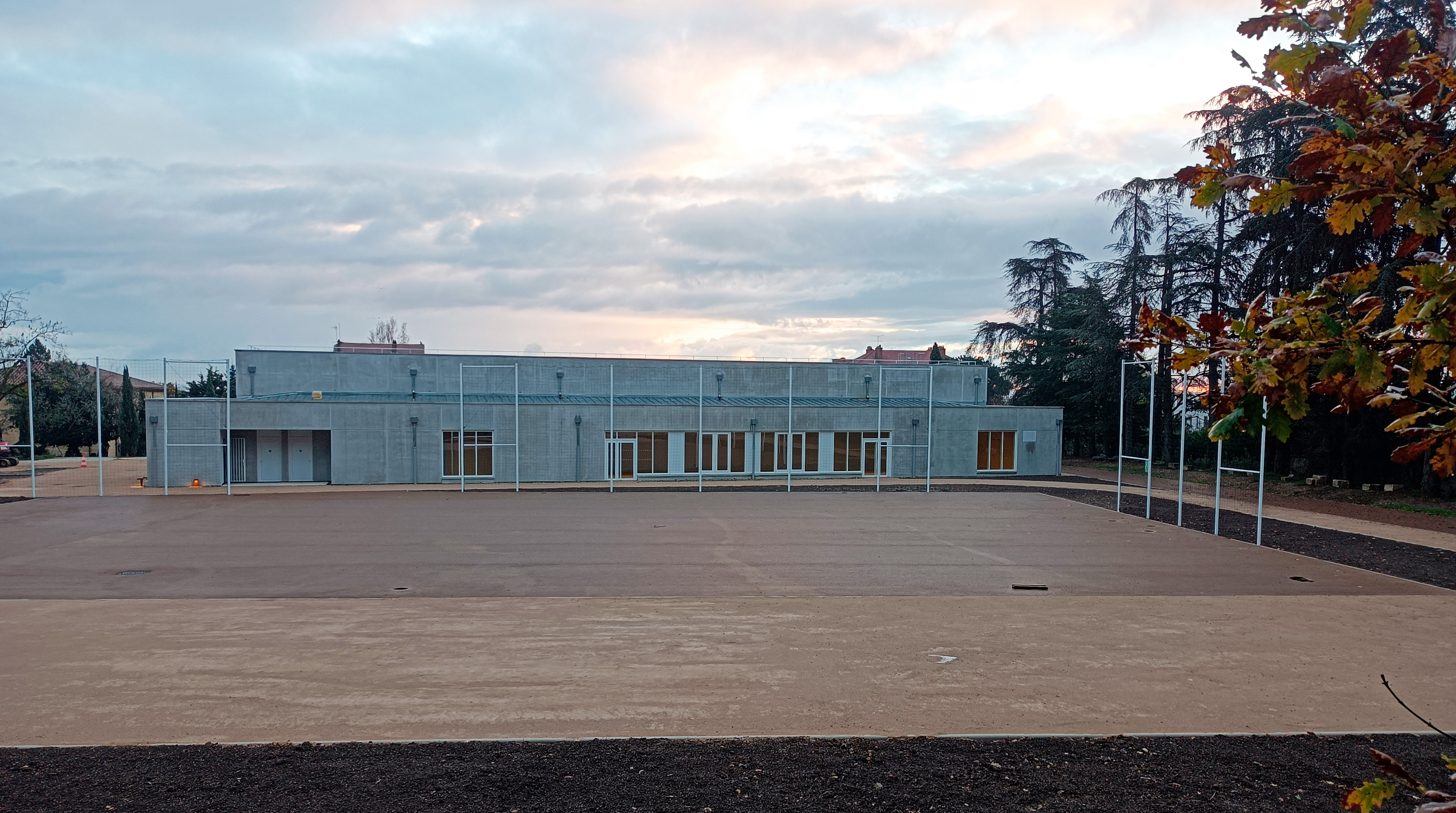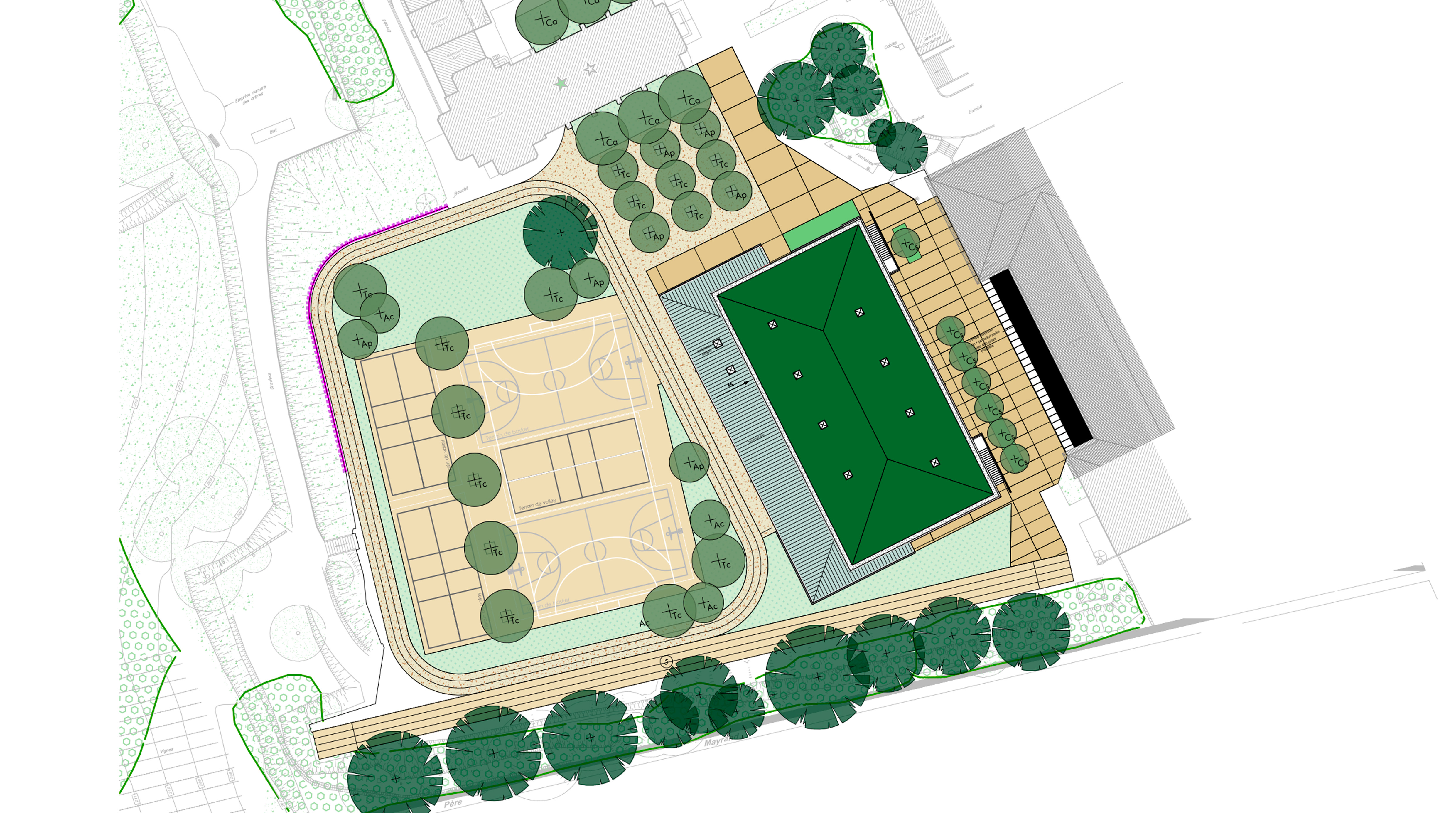Le projet de construction du nouveau gymnase de l’établissement Saint-Thomas d’Aquin s’inscrit au cœur d’un site scolaire à forte valeur patrimoniale et paysagère, marqué par la présence de bâtiments historiques et de la chapelle classée. Implanté sur l’actuel secteur sportif, entre la chapelle, les bâtiments d’enseignement et la balme boisée, le projet adopte une implantation en second plan afin de préserver les perspectives et les continuités paysagères. Il s’accompagne de la création d’un plateau sportif extérieur et de la requalification des cheminements et parvis. Les aménagements extérieurs intègrent une gestion alternative des eaux pluviales à la parcelle, par infiltration via des revêtements perméables et des ouvrages enterrés, sans rejet au réseau public. Cette approche garantit la fonctionnalité sportive, la durabilité des ouvrages et une insertion harmonieuse dans le site.