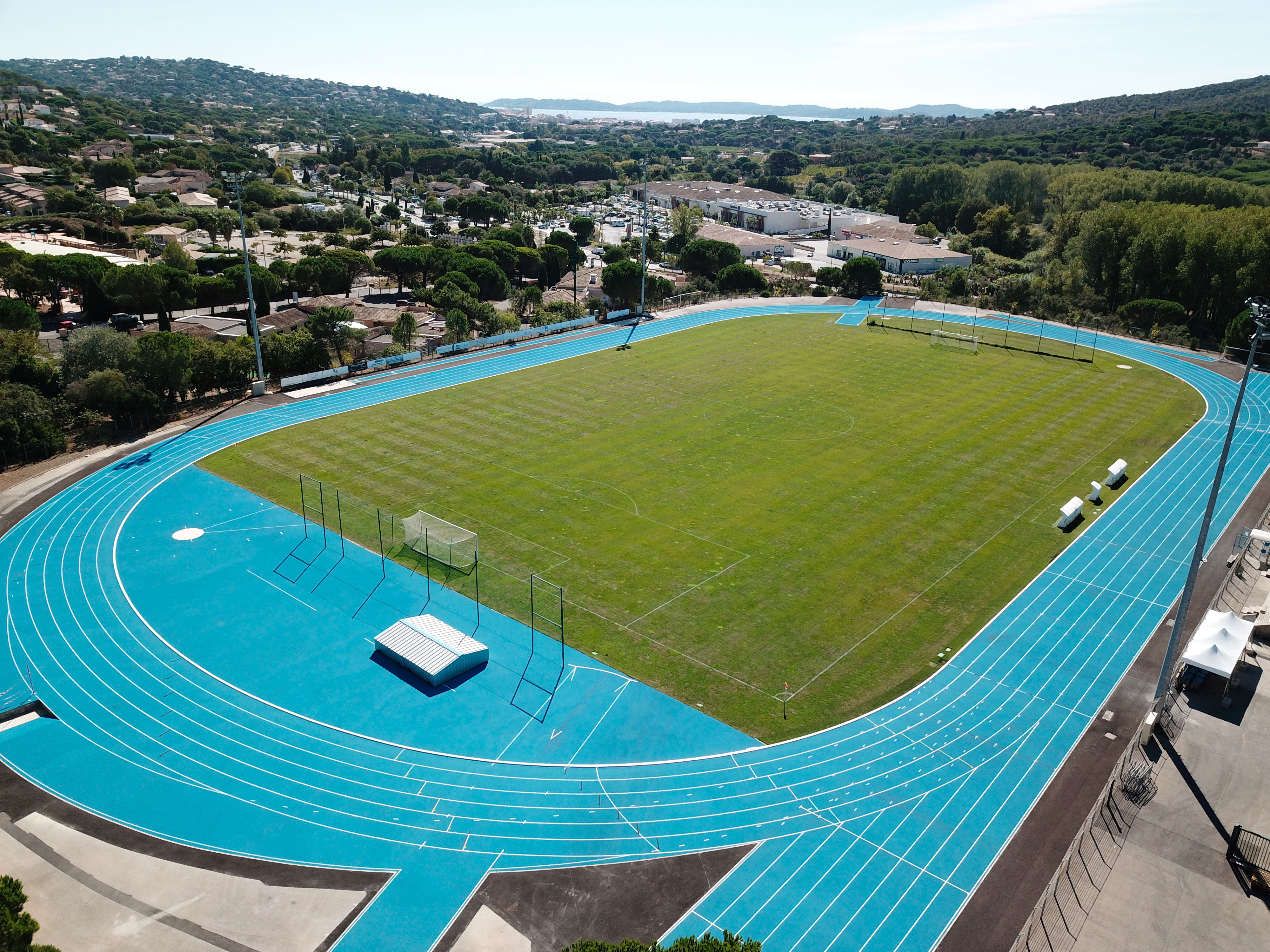 La piste d’athlétisme est composée de 6 couloirs de 400 m et 8 couloirs de 100 m. Son revêtement synthétique est homologué par la fédération. Elle propose également une haie avec rivière de steeple, une aire de lancer de poids, une autre de javelot, une cage homologuée pour le marteau et le disque, un sautoir en hauteur, en longueur et à la perche. Entourée d’un espace naturel, elle est idéale pour le footing, offrant une superbe vue sur la ville et la mer.