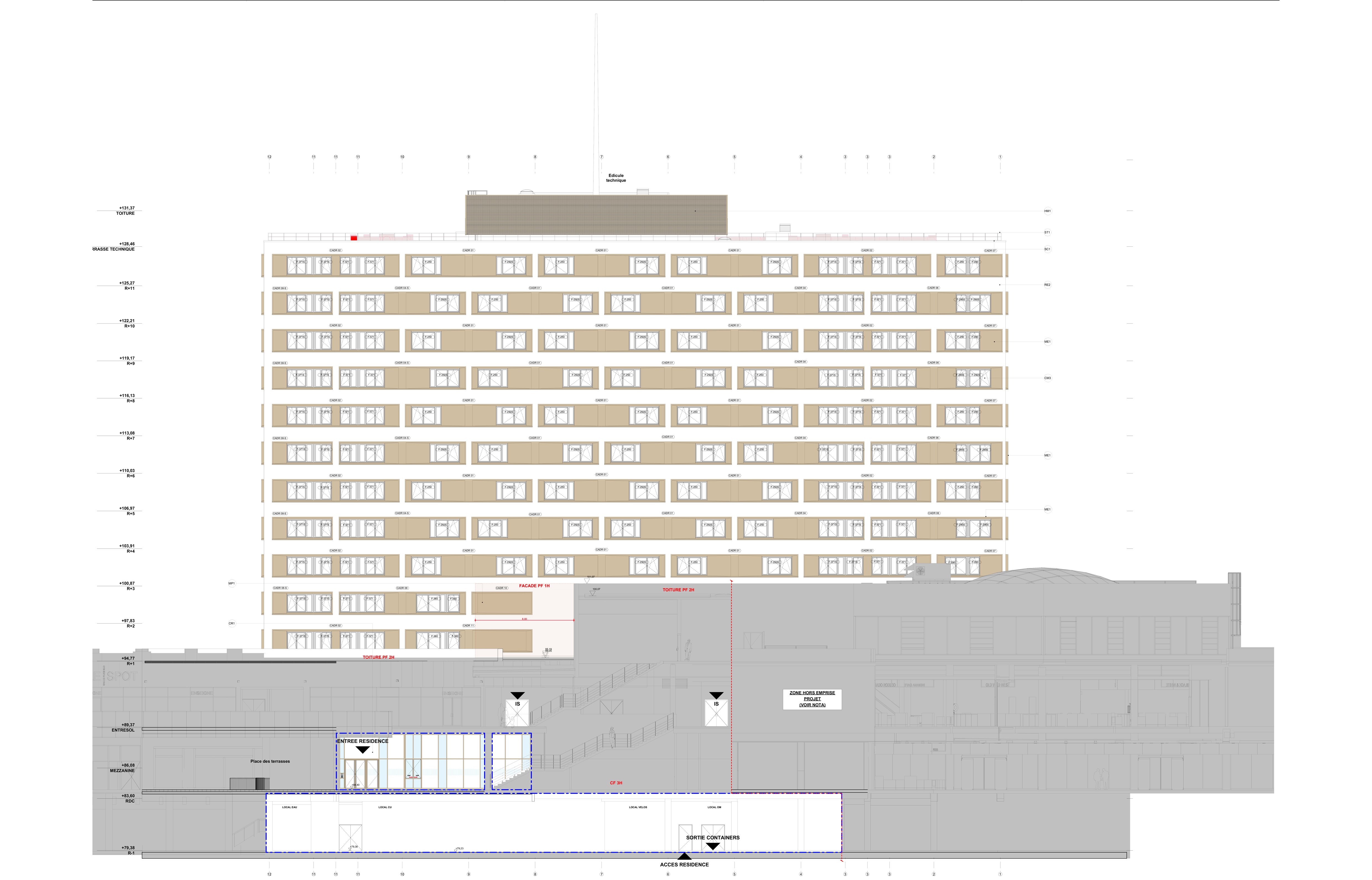 Le projet consiste en la restructuration d’un immeuble en vue de la création d’une résidence étudiante et aux jeunes actifs, située à Évry 2. Le programme comprend un niveau de sous-sol dédié aux locaux techniques et au stationnement, un rez-de-chaussée accueillant un hall d’entrée et des surfaces programmatiques à définir, ainsi que onze niveaux supérieurs regroupant les logements et les espaces communs. La résidence proposera 257 chambres, d’une superficie comprise entre 19 et 45 m², pour une surface de plancher totale d’environ 6 374 m². L’opération s’inscrit dans le respect des réglementations en vigueur et des prescriptions de sécurité applicables, la certification environnementale étant à définir ultérieurement.