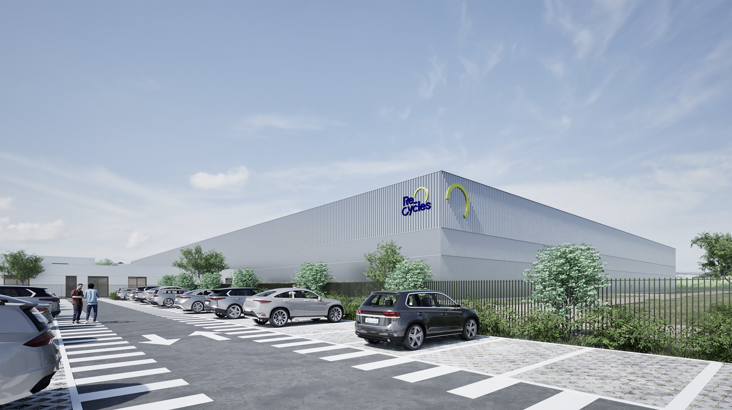 Le projet Re-Cycles s’organise autour de deux entités complémentaires. Les volumes blancs accueillent les bureaux, largement vitrés et ouverts sur l’extérieur, favorisant luminosité, confort et convivialité. Les brise-soleil verticaux apportent à la fois rythme architectural et protection solaire. L’usine de production, quant à elle, se distingue par un traitement en trois strates de bardages métalliques aux ondulations variées, dessinant une architecture sobre et fonctionnelle. L’ensemble exprime une image moderne et dynamique, à la fois opérationnelle et accueillante, incarnant l’ambition d’une entreprise tournée vers l’avenir.